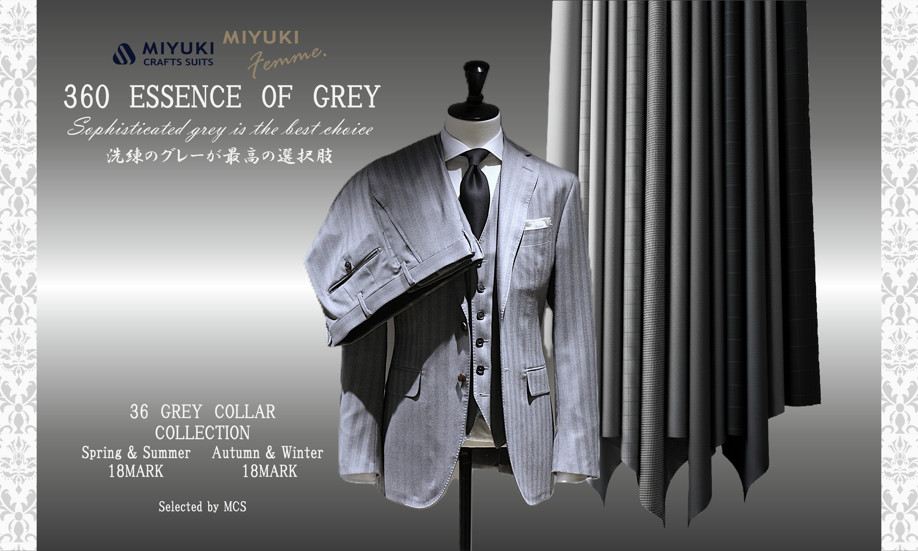 スーツ生誕 360周年を記念し、御幸毛織が長年培ってきたテキスタイルの技術と美意識を結集した年間プロジェクト「360 ESSENCE OF GREY」 を展開します。スーツの本質とも言える“グレーカラー”に改めて焦点を当て、2026 年春夏・秋冬でそれぞれ18マーク、合計36マークのグレー生地をご用意。グレーの多彩な表現を通じて、スーツの新たな価値と魅力を提案します。春夏生地は 3 月初旬から展開しております。